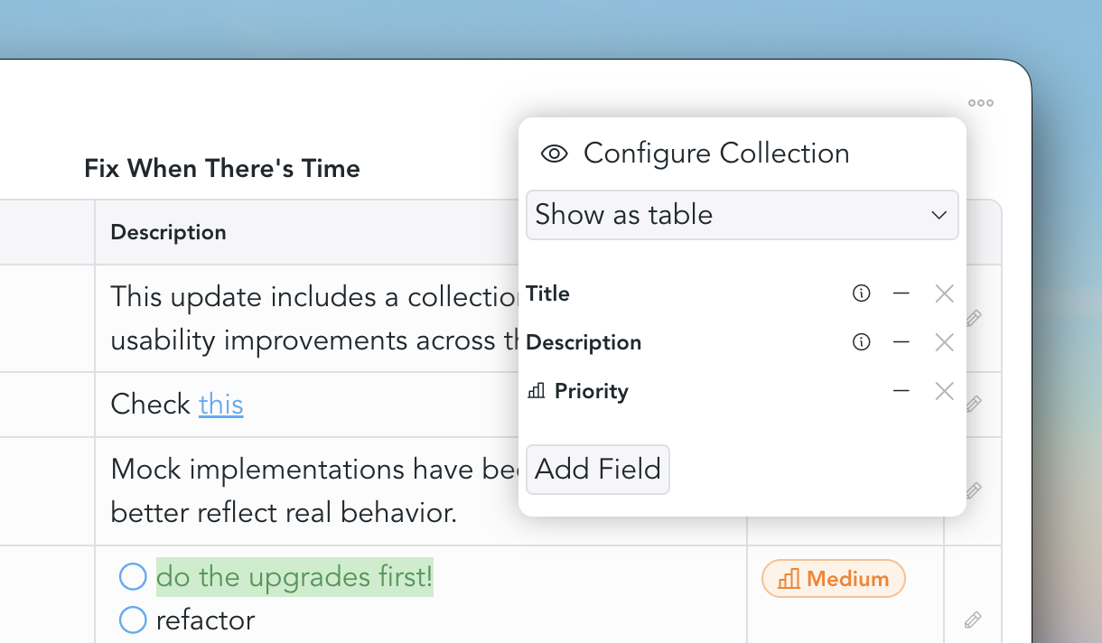 For every collection, we can define which fields should be displayed. In a table, these fields correspond to columns. In task management, fields represent the properties a task can have, such as priority or due date.
