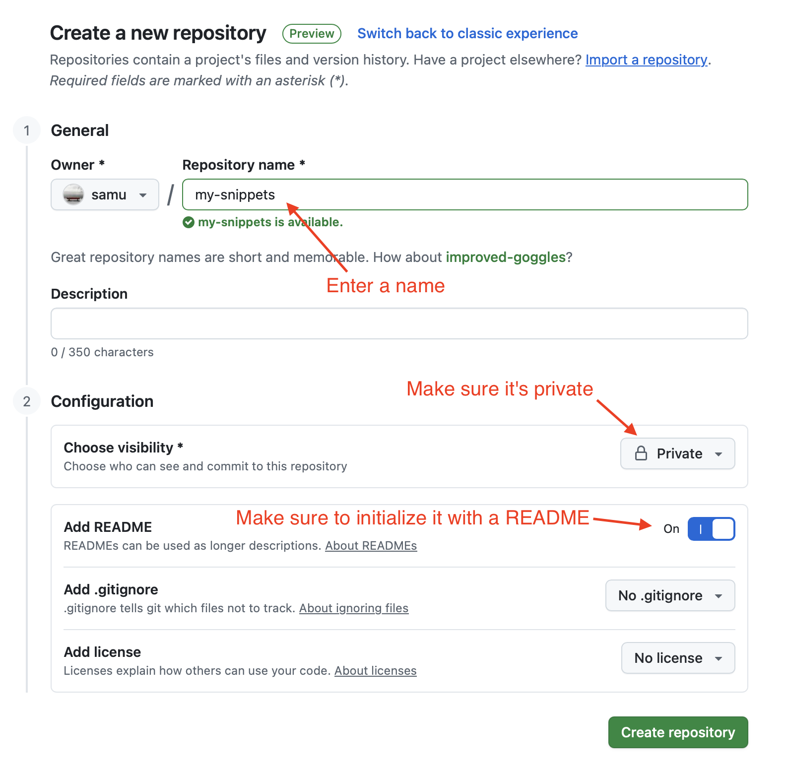 - Choose a name, set the repo to private, and initialize it with a README