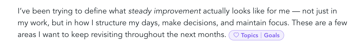 Snippets can be linked together through references. References allow you to connect related pieces of information without placing them into a fixed hierarchy. This makes it possible to navigate quickly between ideas, follow chains of thought, and build a network-like structure where meaning emerges from connections rather than location.
