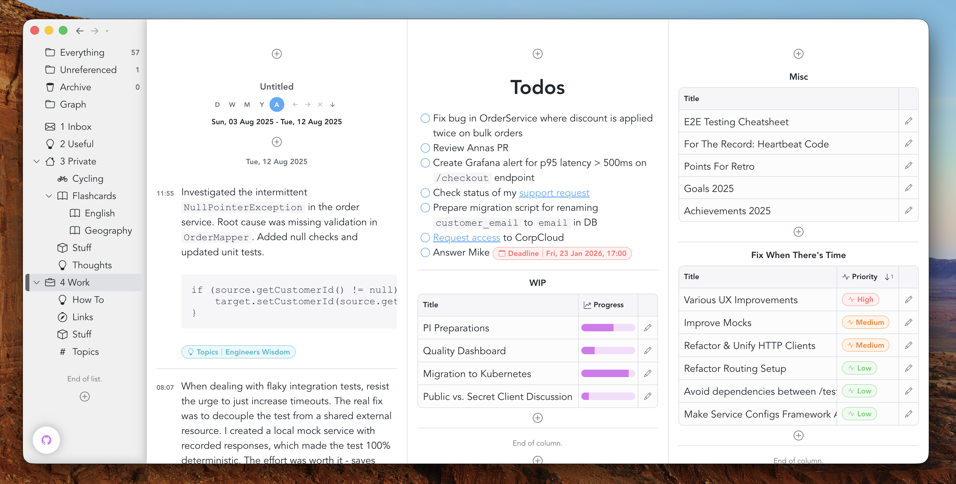 Dashboards offer a more visual way of working. They provide a two-dimensional workspace where multiple elements can exist side by side, making it easy to keep related information together. Rather than relying on hierarchy, dashboards support spatial organization: content is arranged visually, and relationships emerge from layout and proximity. This makes dashboards especially well suited for overviews, projects, and workflows where seeing multiple pieces of information at once is valuable.